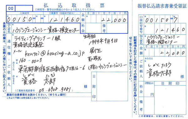郵便局に用意されている払込取扱票に必要事項を記入して、郵便局の窓口もしくはATMから受講料をお支払い下さい。